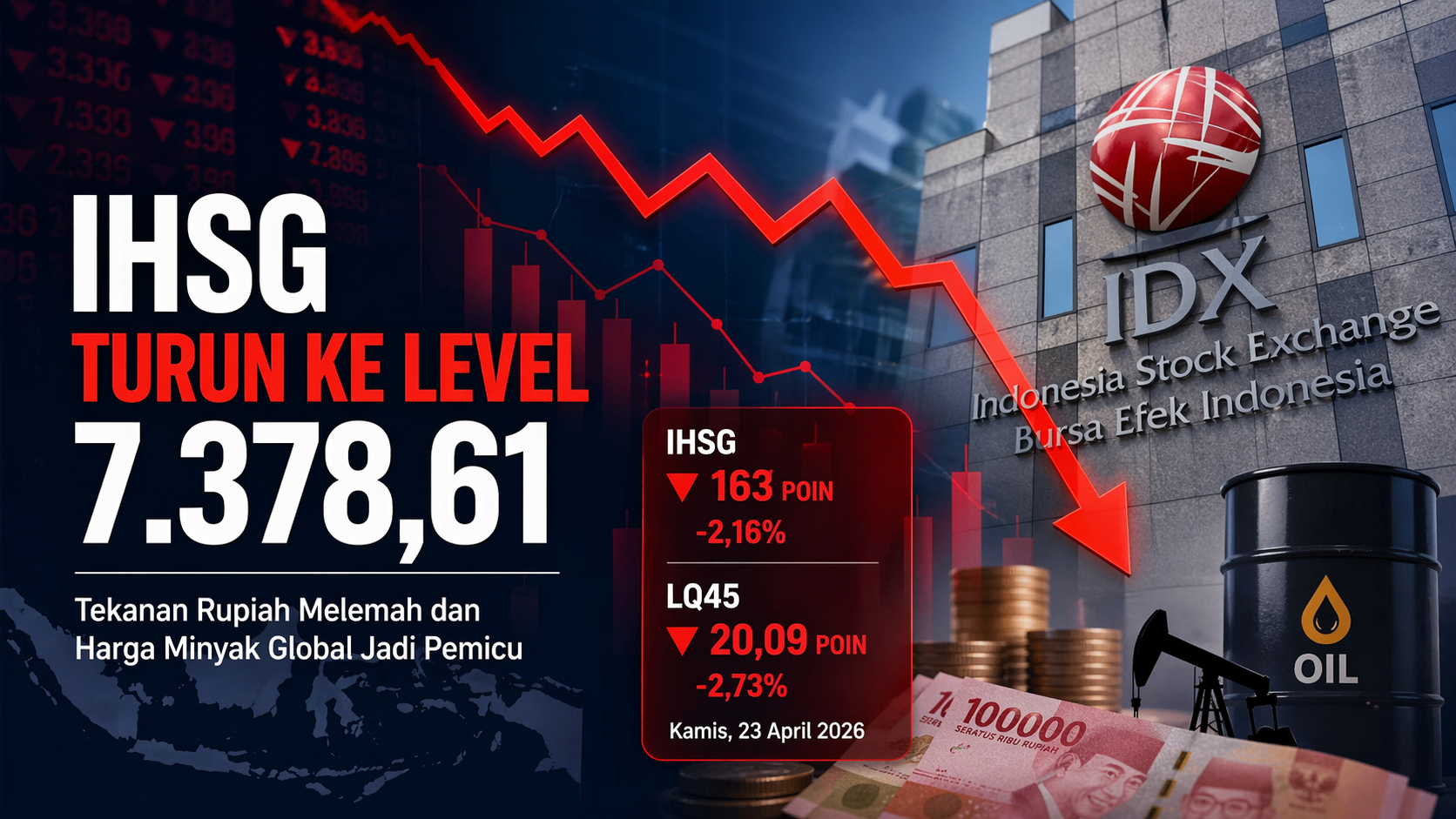 Tekanan nilai tukar rupiah dan lonjakan harga minyak global menjadi pemicu utama pelemahan IHSG di akhir perdagangan.