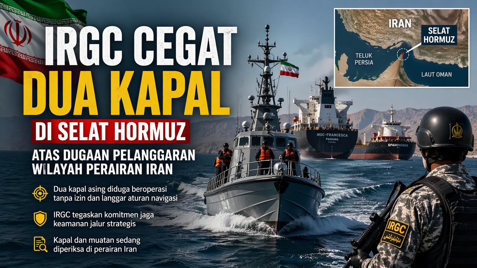 IRGC juga menyebut bahwa kedua kapal sempat berupaya meninggalkan Selat Hormuz secara diam-diam sebelum akhirnya berhasil dideteksi dan dicegat oleh unit patroli laut. Saat ini, kedua kapal telah dibawa ke perairan Iran untuk menjalani pemeriksaan lebih lanjut, termasuk pengecekan muatan, dokumen, serta catatan operasional.