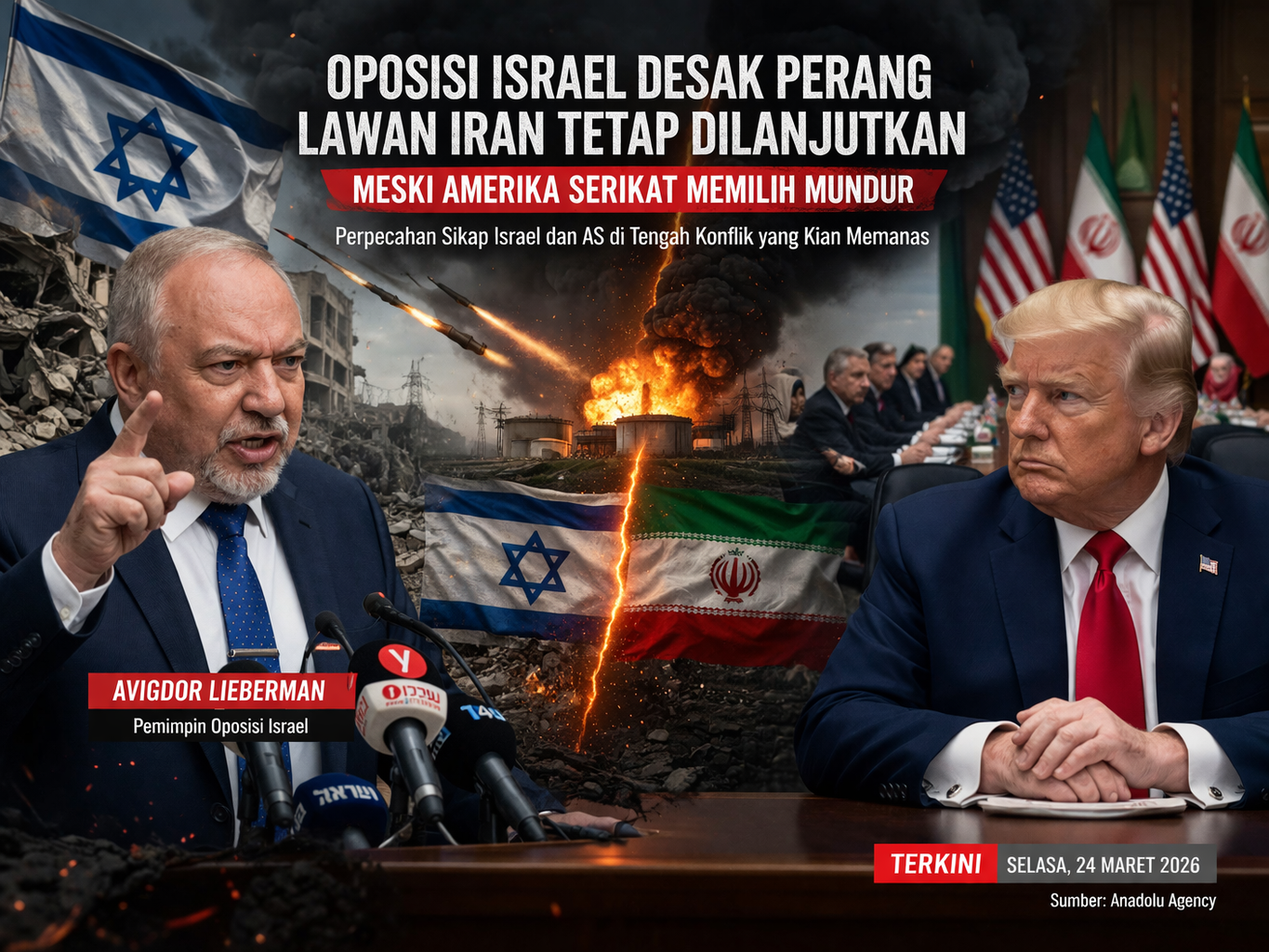 Situasi politik dan keamanan di Timur Tengah kembali memanas setelah tokoh oposisi Israel, Avigdor Lieberman, mendesak agar operasi militer terhadap Iran terus dilanjutkan, meskipun Amerika Serikat memutuskan untuk tidak lagi terlibat secara langsung.