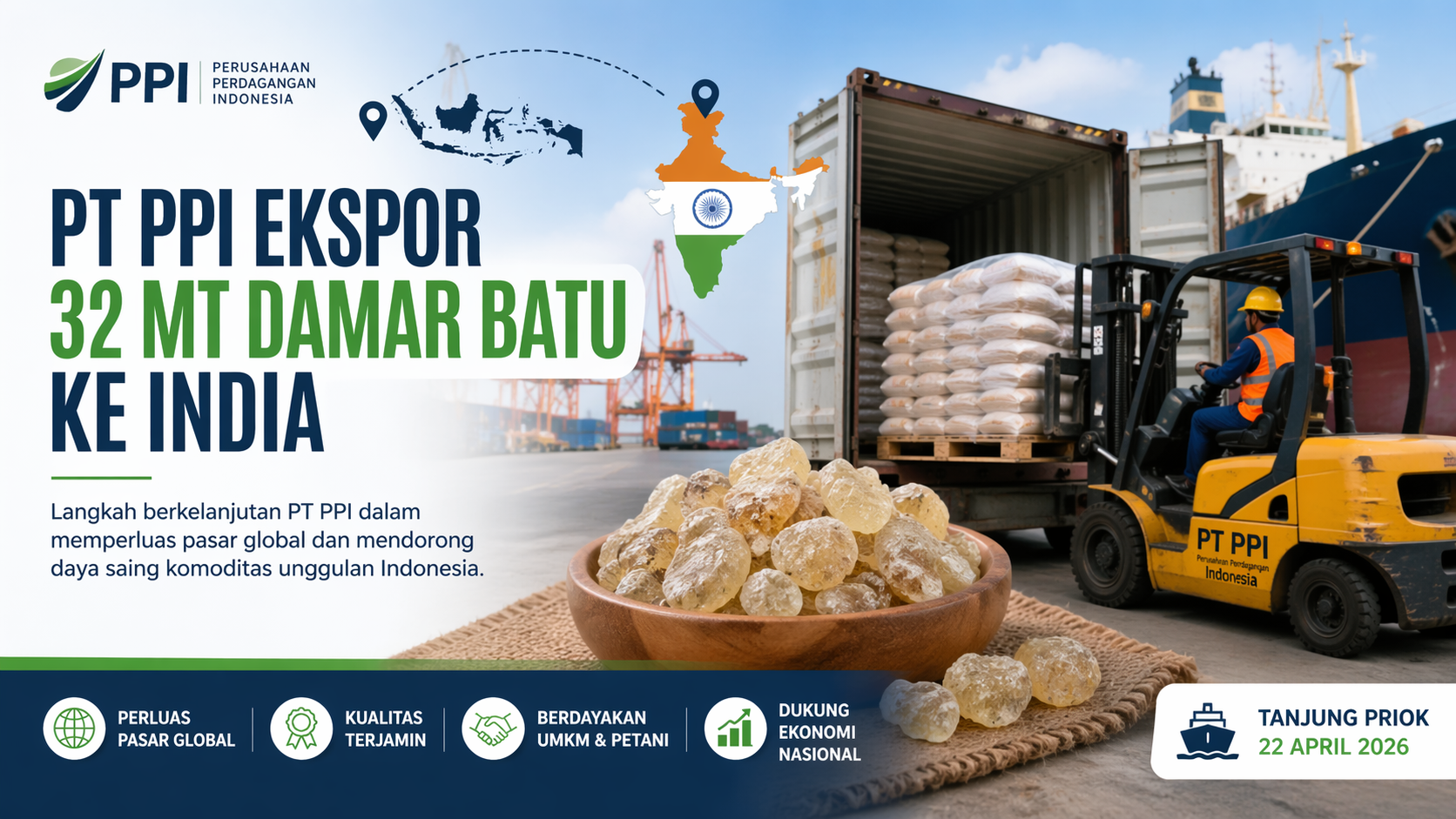 Jakarta- PT Perusahaan Perdagangan Indonesia (PPI) kembali memperluas jangkauan ekspor nasional dengan melepas pengiriman damar batu seberat 32 metrik ton (MT) melalui Pelabuhan Tanjung Priok menuju India, Rabu (22/4/2026). Langkah ini menjadi bagian dari strategi berkelanjutan perusahaan dalam meningkatkan daya saing produk Indonesia di pasar internasional sekaligus memperkuat penetrasi komoditas unggulan nasional.