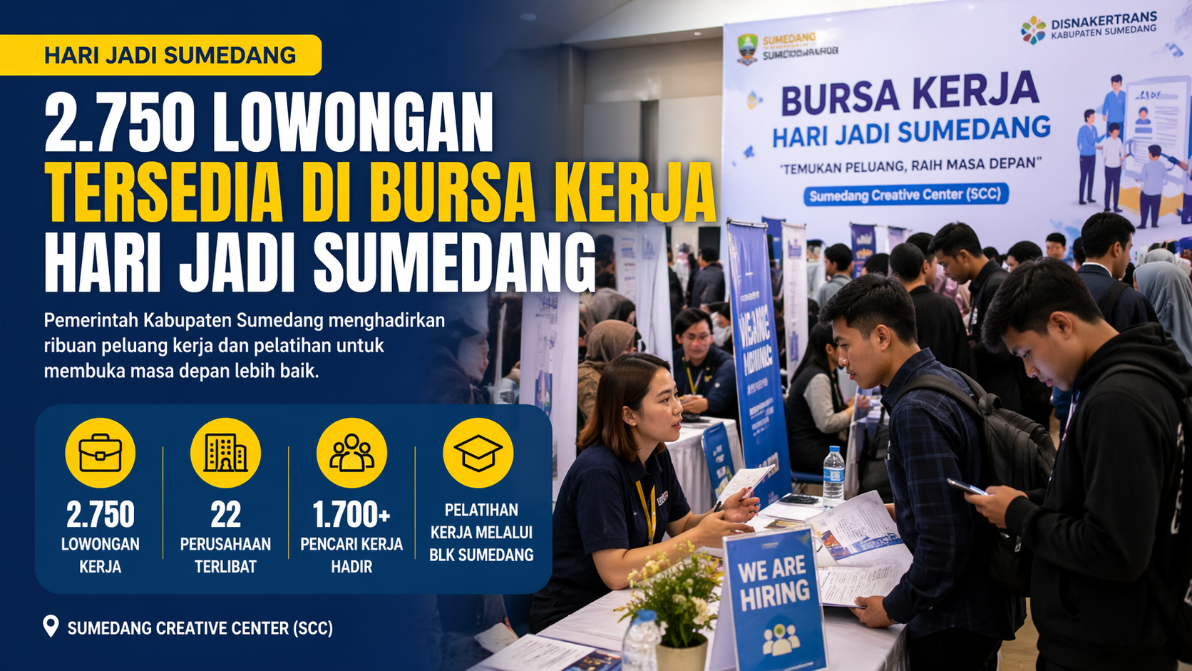 Sumedang– Pemerintah Kabupaten Sumedang, Jawa Barat, menghadirkan sebanyak 2.750 peluang kerja dalam kegiatan bursa kerja yang digelar bertepatan dengan peringatan Hari Jadi Sumedang di Sumedang Creative Center (SCC). Kegiatan ini menjadi upaya pemerintah untuk mempertemukan perusahaan dengan para pencari kerja.