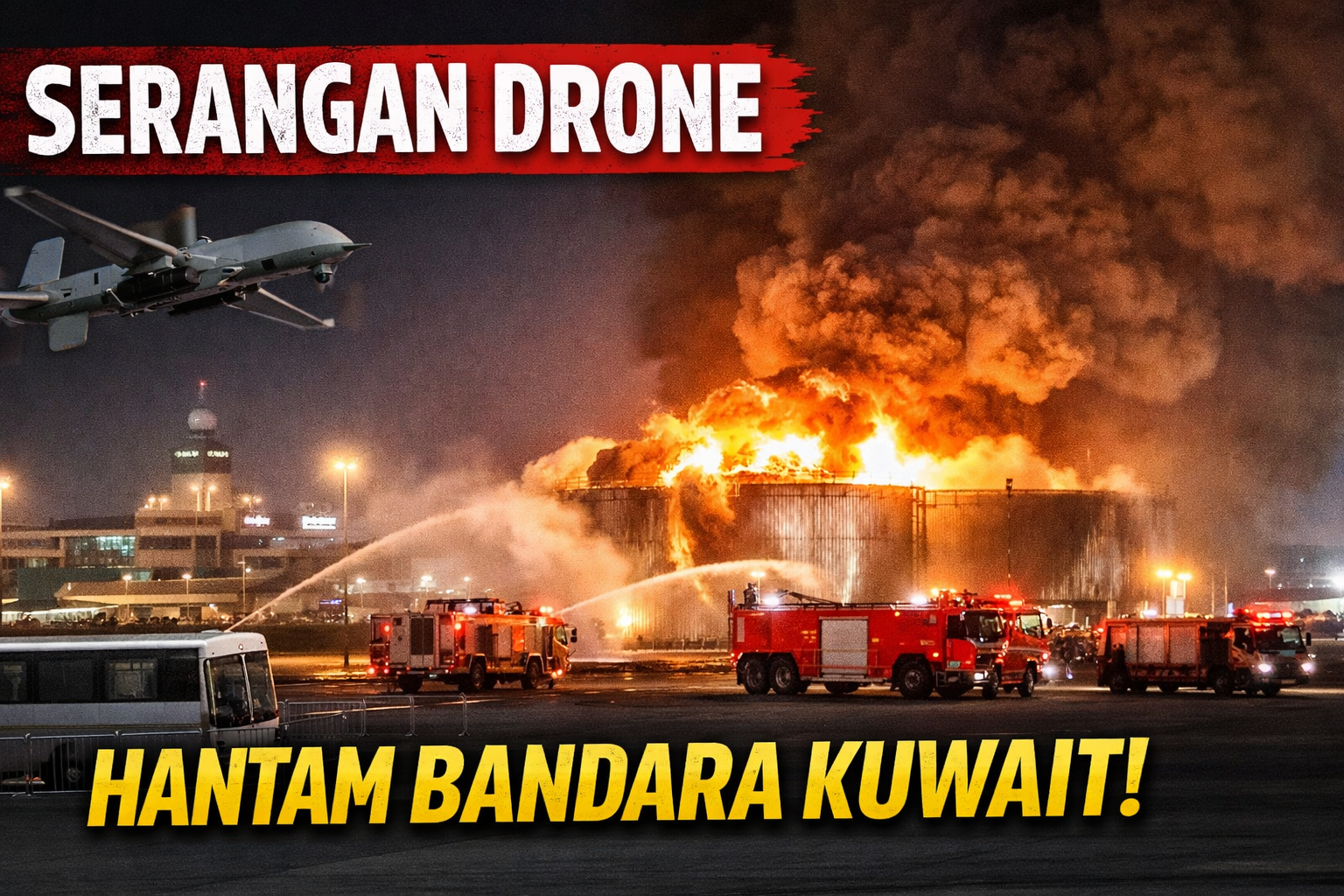 Kuwait City: Sebuah pesawat nirawak yang diduga berasal dari Iran menyerang tangki penyimpanan bahan bakar di Bandara Internasional Kuwait pada Rabu, 1 April 2026. Insiden ini memicu kebakaran besar, namun tidak menimbulkan korban jiwa, sebagaimana dilaporkan oleh kantor berita resmi KUNA.